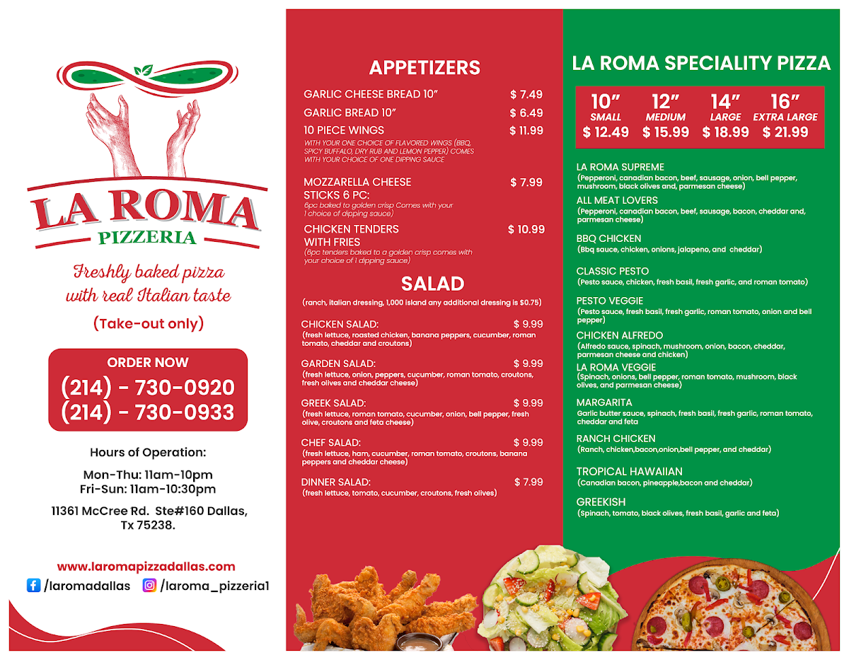 Welcome to La Roma Pizzeria / Mexican Fooderia, a delightful culinary haven located at 11361 McCree Rd, Dallas, TX. This vibrant eatery expertly marries the rich flavors of Italian and Mexican cuisines, crafting a menu that’s both diverse and tantalizing.